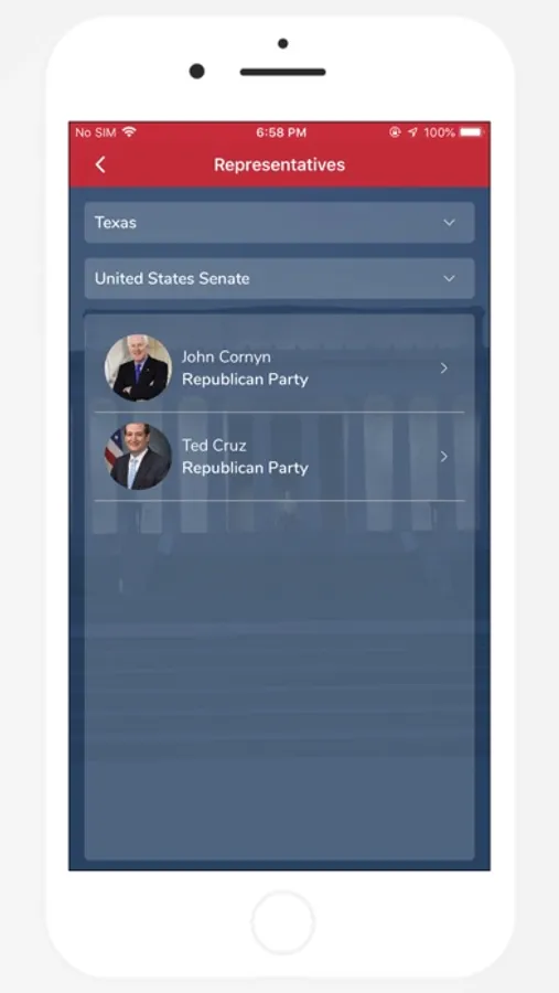 User can view their State, Federal and local representatives based on their location.