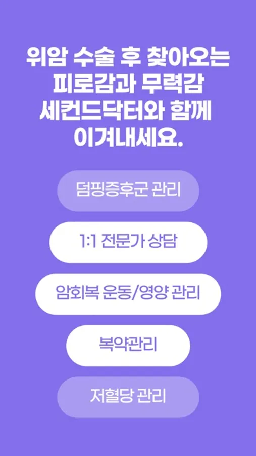 위암 by 세컨드 닥터는 암 수술 후 빠른 회복과 삶의 질 향상을 필요로 하는 분들을 위해 만들어진 개인 맞춤형 전문 건강관리 솔루션입니다.