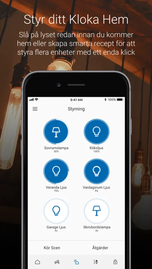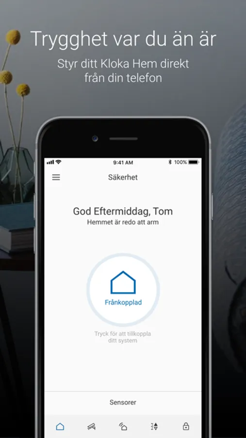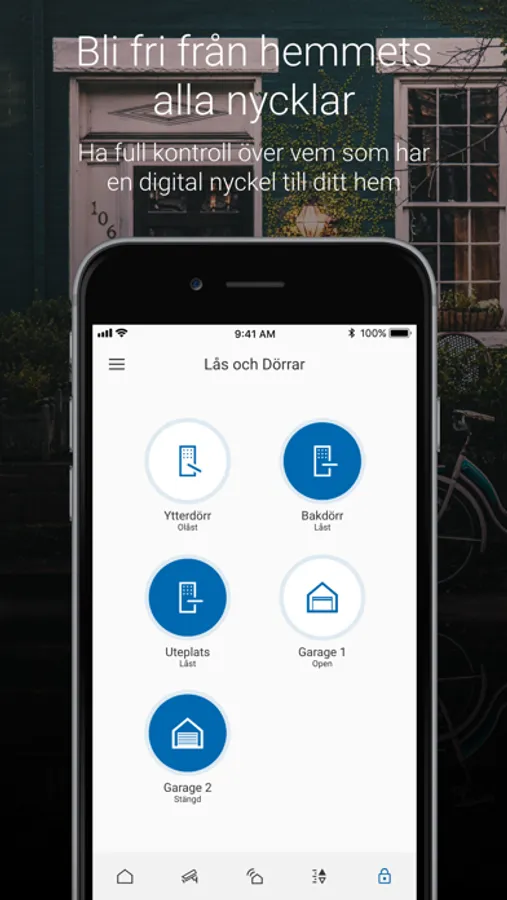 En app för att styra larm, lampor, lås, kameror, termostater, garagedörrar och andra smarta enheter.