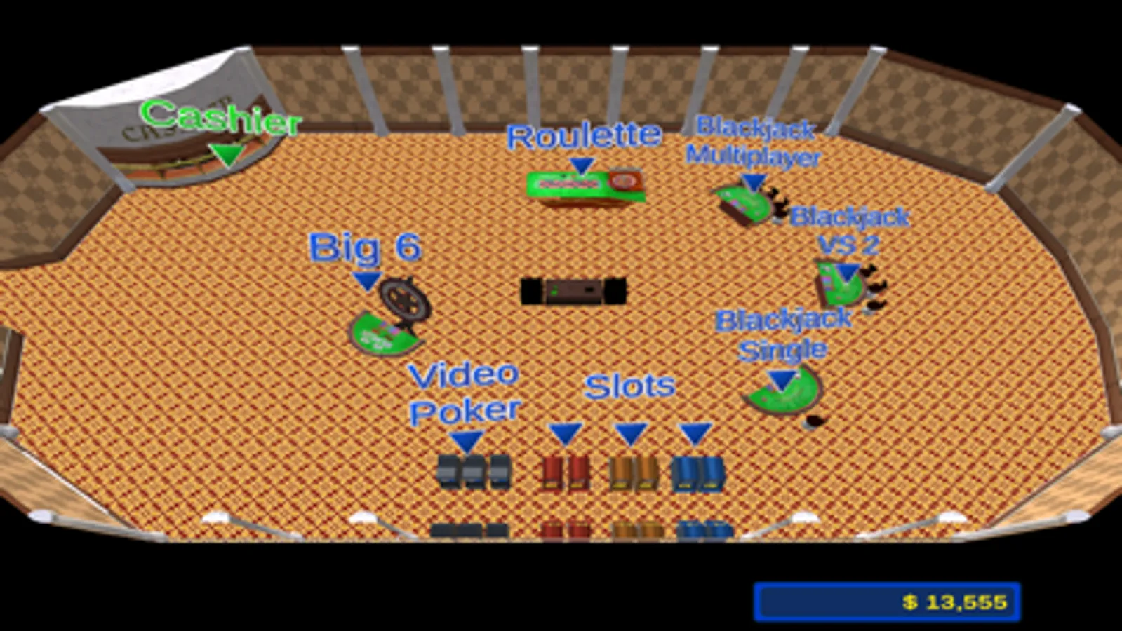 Choose between blackjack, roulette, Big-6 Money Wheel, video poker, and a variety of slot machines.