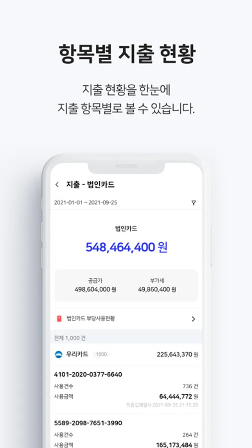 법인카드로 지출한 카드사용내역을 자동으로 저장해서 조회되며, 부당사용현황까지 조회됩니다.