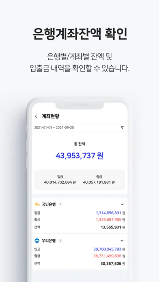 등록된 은행계좌의 입금, 출금, 잔액을 각 은행홈페이지에서 자동저장 및 은행잔액을 조회합니다.