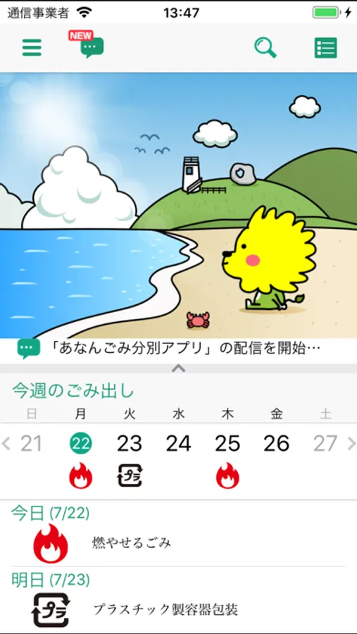 収集日変更のお知らせやイベント情報などを確認することができます。