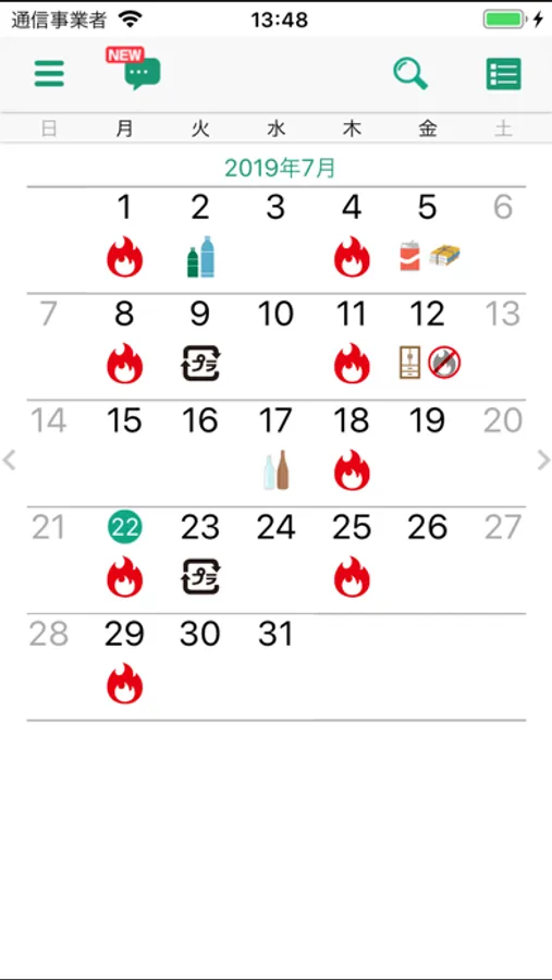 今日と明日、週ごと、月ごとの3パターンによるごみ収集日程を一つの画面ですぐに確認することができます。