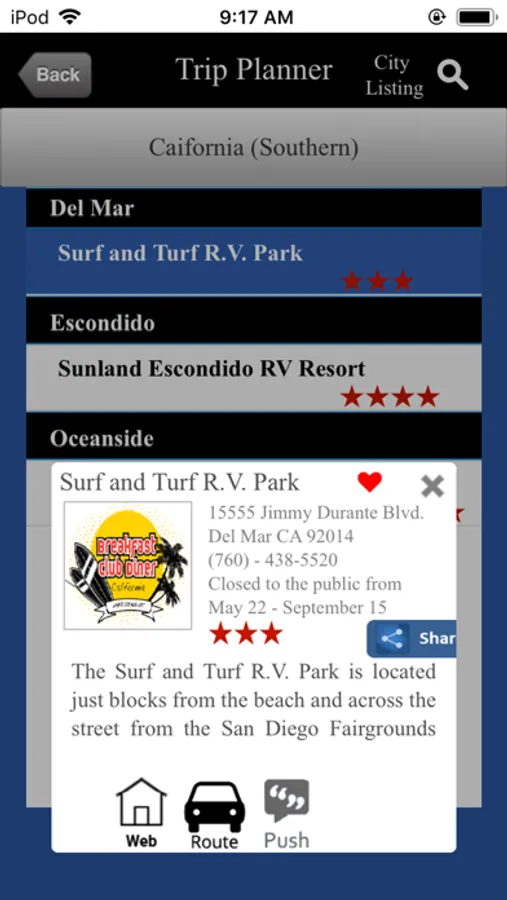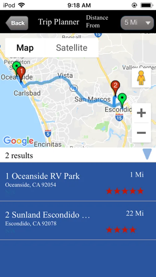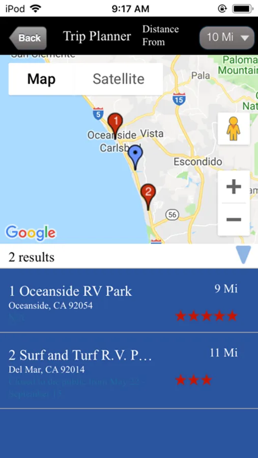 Provides a list of participating RV Parks within a specified distance (5 mi, 10 mi) of your current location. The results are provided either alphabetically or by distance.