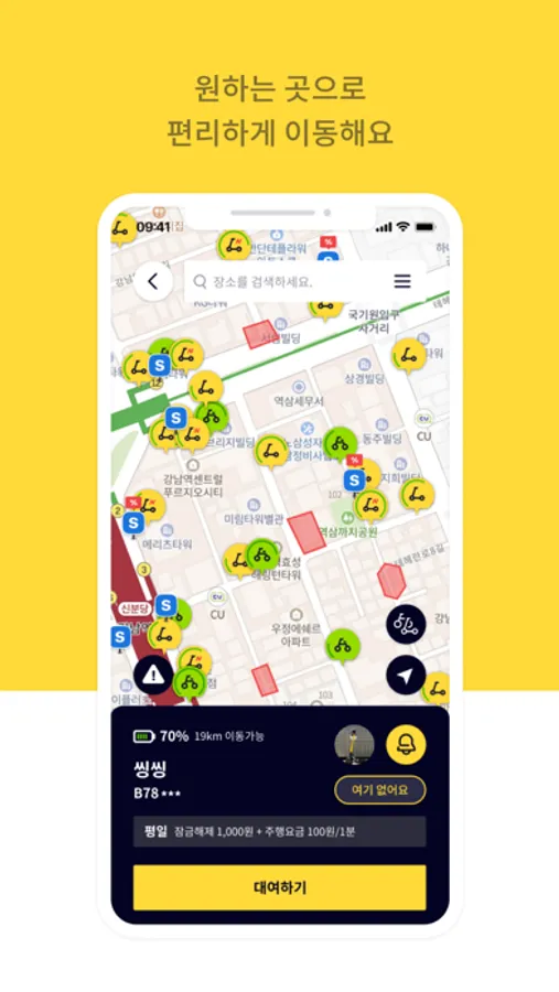 1. 앱을 실행하여 주변의 가까운 씽씽 전동킥보드를 찾습니다.