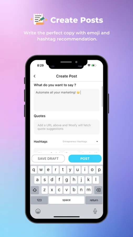HelloWoofy's app allows our members to post video, photo or just caption based content or see their scheduled and posted content as well. With one click, you can save both time and effort using the app's built in AI to autocomplete content or suggest the most relevant emojis and hashtags. Grow your social media and digital following and presence with ease!