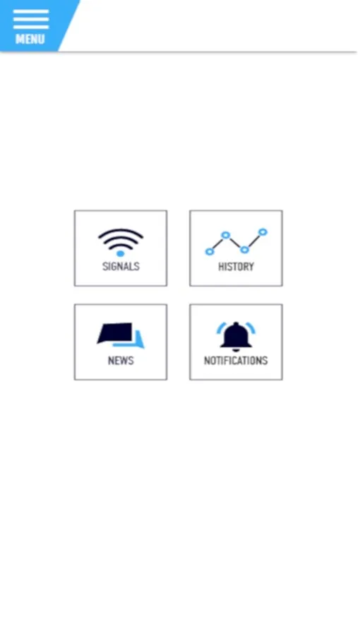 In this screen, you can find 4 icons that drive you to each screen of the app. The screens are Live Signals, History, News, Notifications.