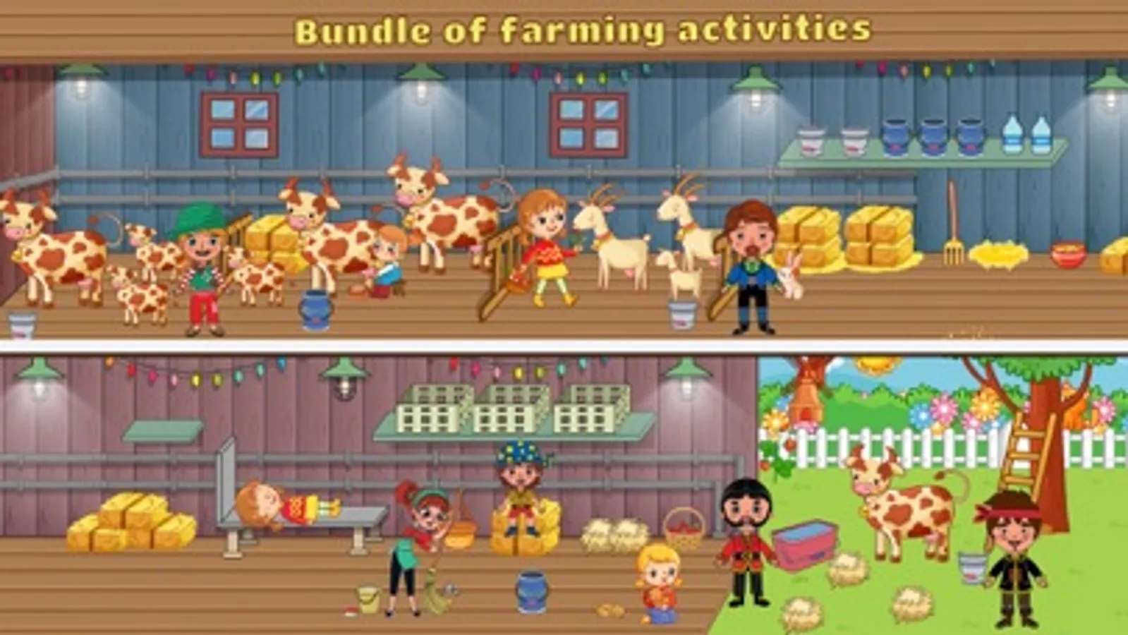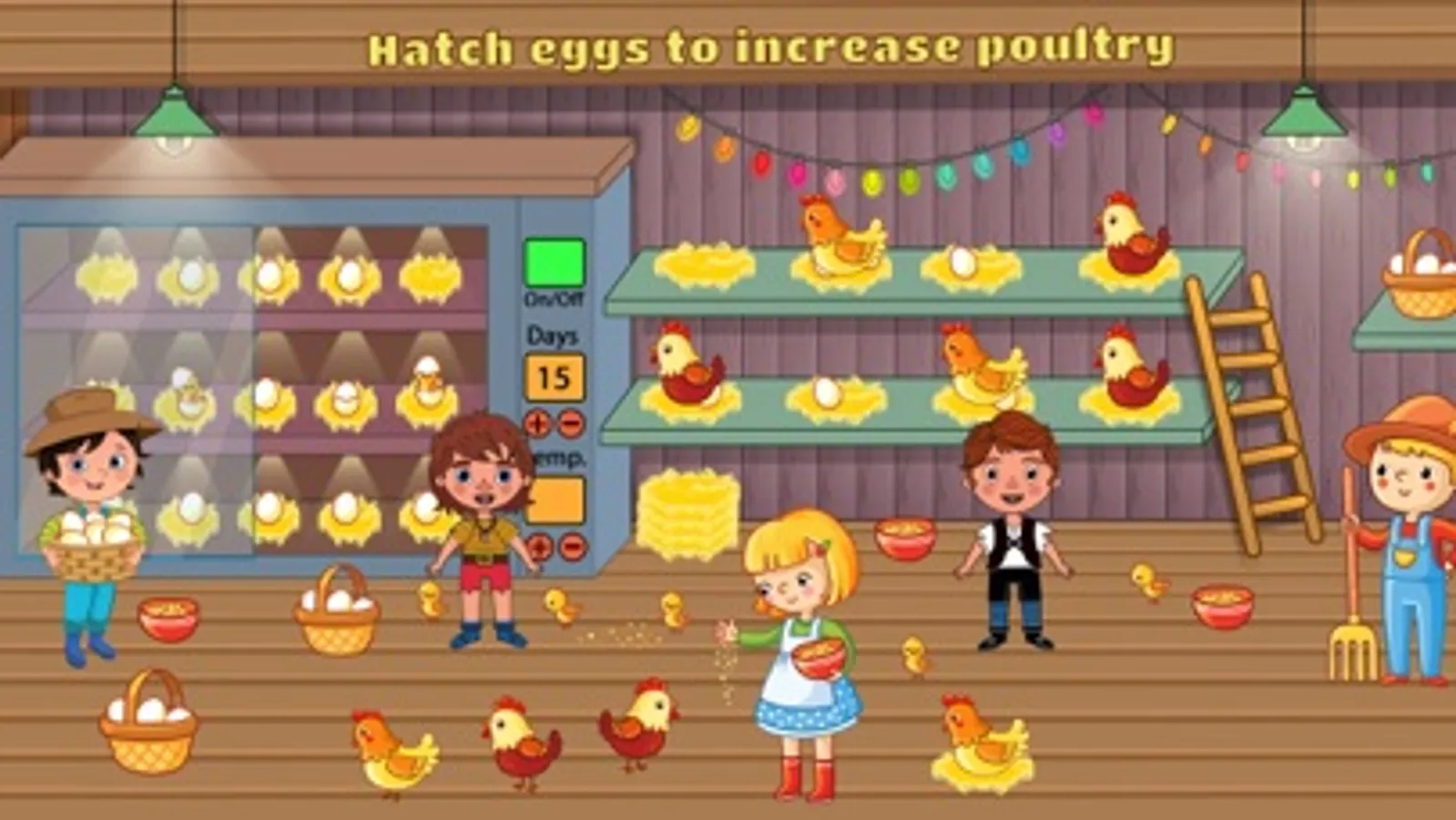 Pretend Play Village Life brings your nearest to farming life outside city. Run your poultry ranch, horse stable and grow multiple crops of carrots, wheat and cabbage. Take care of your cute pets. Clean the stables, harvest cops and gather milk from the dairy farm. Process milk, pack in bottles to keep it fresh. Hatch eggs in poultry farm to increase your flock numbers.