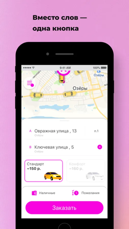 Откройте приложение, укажите адрес и закажите такси, нажав на одну кнопку.
