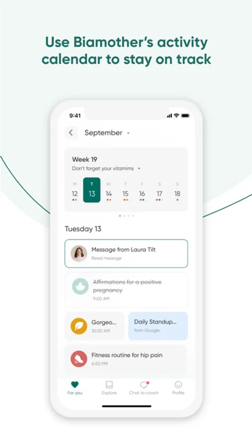 Keep it simple by following our daily recommendations. By considering your goals and challenges, Biamother provides a comprehensive programme, to help you move more, eat well, and balance your mindset.
