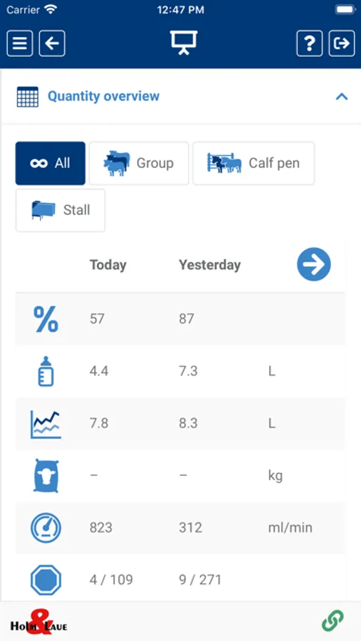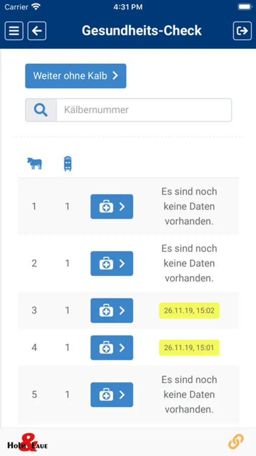 Der Gesundheits-Check leitet Sie durch einen kompakten Fragenkatalog zur Beurteilung der Kälbergesundheit. Sie können die Gesamt- und Einzelergebnisse für jedes Kalb speichern, vergleichen und über die Kälberliste abrufen. Sie können den Gesundheits-Check auch nutzen, wenn Sie kein Holm & Laue Produkt mit der CalfGuide App verbunden haben.
