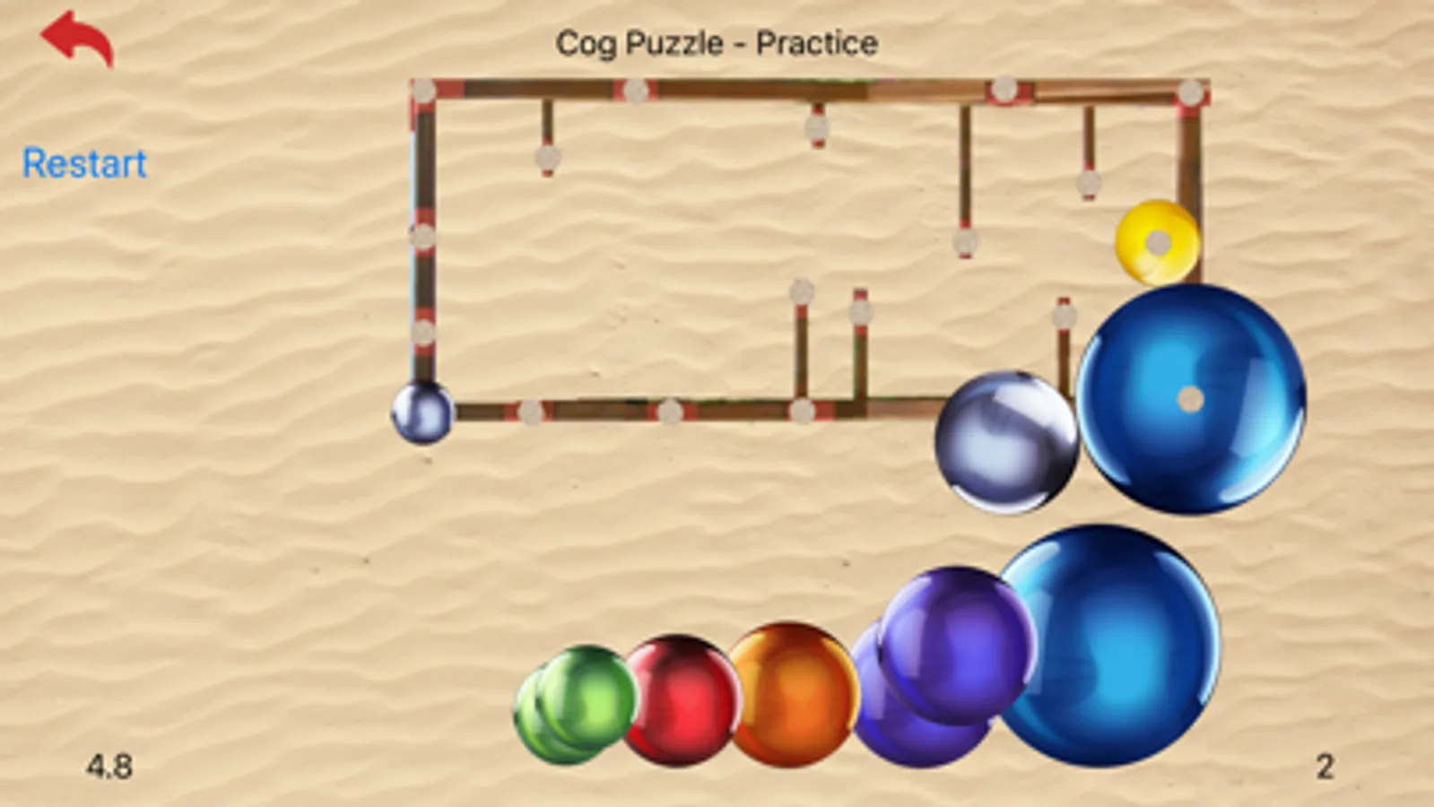 There are 9 different cogs that need to be placed on the frame and 2 cogs that cannot be moved. There are more than nine places that the cogs can be placed. They must be arranged in such a way that the cogs work together to turn the last set cog.