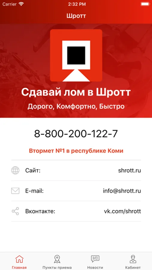 Приложение компании Шротт поможет сдать черный и цветной лом в городах Республики Коми. В приложении Вы найдете новости и акции компании, контактные данные пунктов приема.