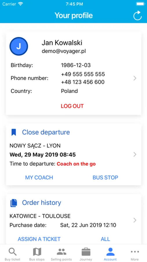 MY ACCOUNT - offering the possibility to create a Customer Profile, where the user can view, among others, into the history of your tickets and tickets related to the upcoming travel.In addition, creating a profile allows you access to the BUS INFO tool, where the passenger, an hour before the scheduled departure, can view the location and the number of his coach.