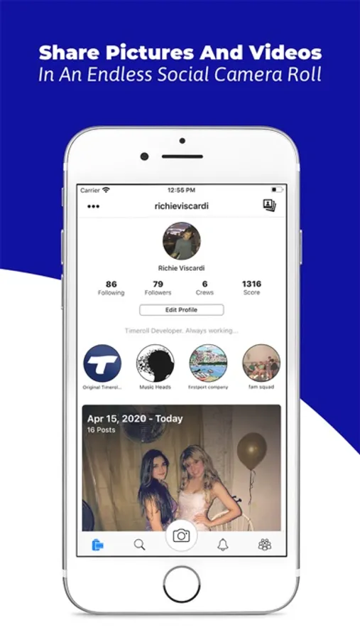 Timeroll allows your friend group(s) to share pictures and videos with the world. Traditional social media focuses on an individual sharing, posting, and growing their own brand. With Timeroll you can share, post, and grow as a group together. It is the first social media that successfully allows you to post as a collective unit.