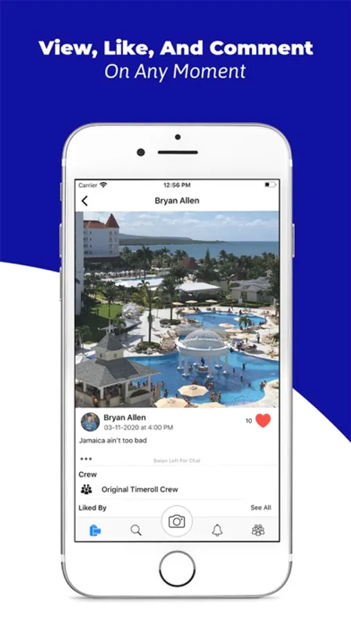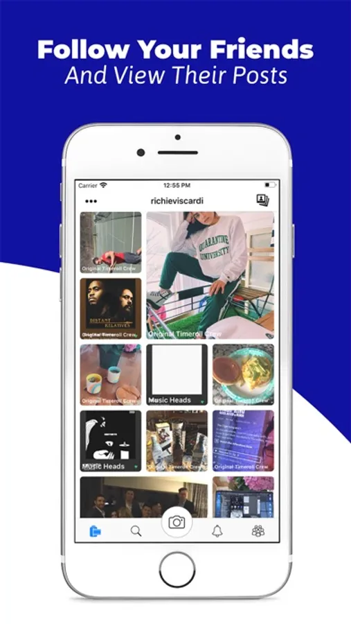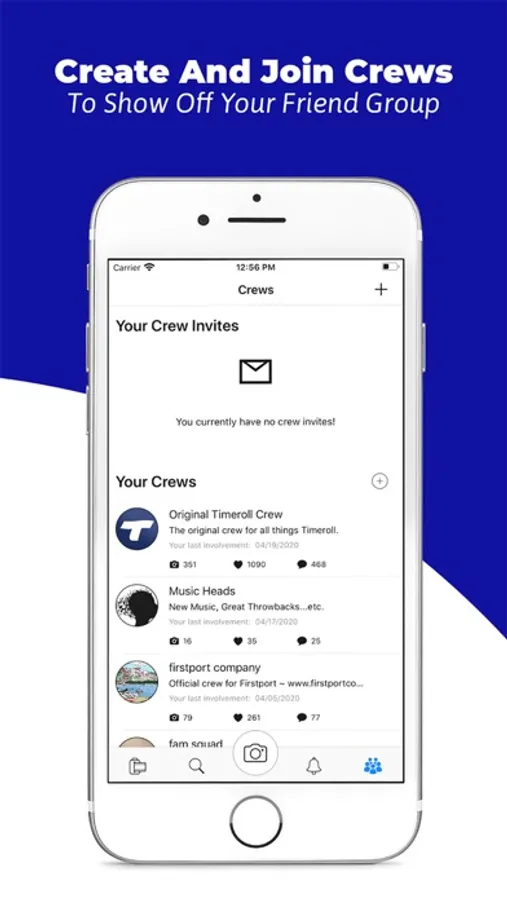 The main feed of Timeroll is called the Mainroll. Your Mainroll consists of all your posts, as well as the posts of those you follow. You can start posting to the Mainroll as a group by creating or joining a crew. Your crew acts as a real life friend group. You can join as many crews as you like, and post to any of them at any time. Each crew has its own profile where you can see the members, total likes, total comments, and all the Mainroll posts from those who posted with that crew.