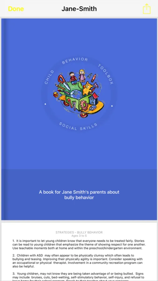 Parents can attach a note along with their selected strategies with personalized instructions if someone else is going to be looking after their child. The report can be viewed on screen, saved to a pdf file for future reference, printed out in a book format and sent as an attachment to a text message, emailed, saved to iCloud, or exported to Apple Books©. Teachers can select strategies to provide parents with ideas for managing behavior at home.
