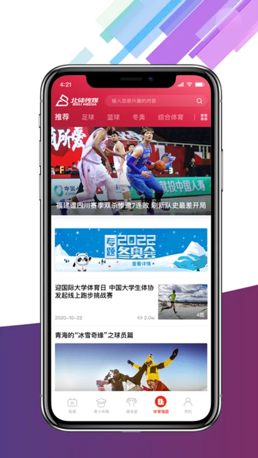 【体育强国】涵盖各国家队备战的新闻以及各体育协会的动态,《体育故事》、《体育人物》等内容规划均已经被提上了日程。除了依靠直播和教学两大主打内容吸引用户,北体传媒APP还会致力于体育文化的弘扬与传播!