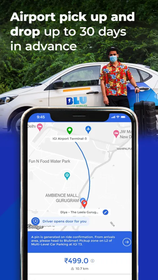 Convenient airport taxi services: Need an airport taxi in Gurgaon, Delhi NCR or Bengaluru? BluSmart’s airport taxi services are hassle-free because there are no last-minute cancellations & you can schedule them up to 30 days in advance. Our electric cabs also have a jumbo boot space for all your luggage.