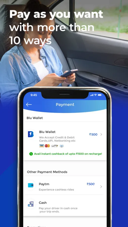 Multiple payment options: With over 10 ways to pay, including credit and debit cards, UPI, Net banking, Paytm, MobiKwik, PayZapp, and Freecharge you can make cashless payments through our BluSmart cab booking app. You can also add money to your BLU WALLET to pay for the cab ride.