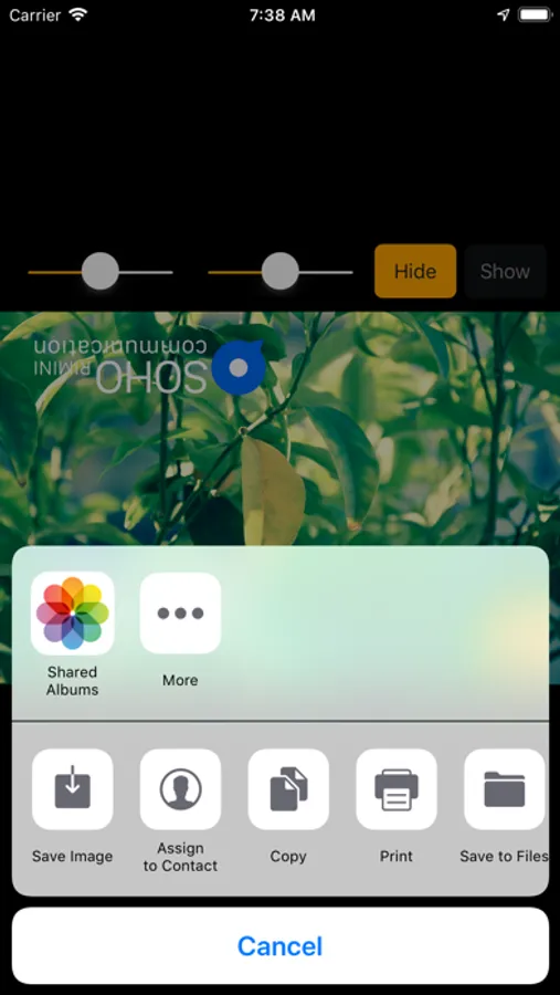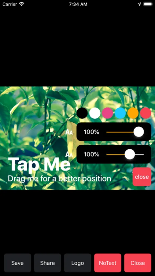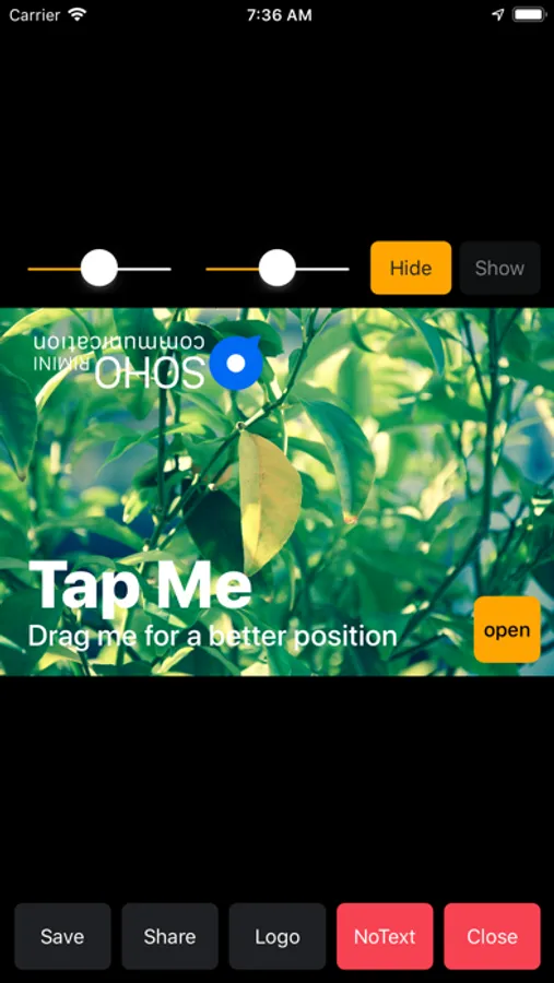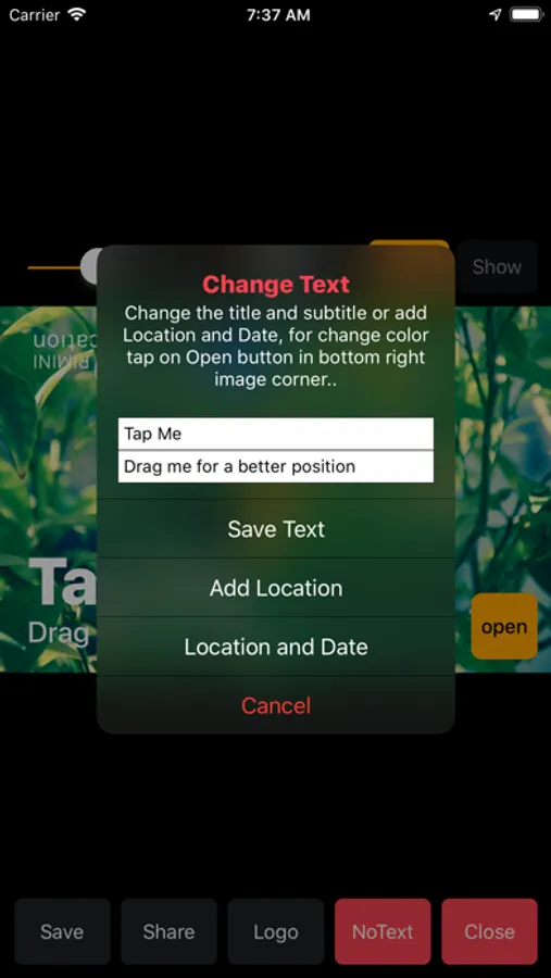 If you want to add text tap on Show Text, tap on it for edit, add location and date or move text where do you want, now you simply Save/Share, simply!
