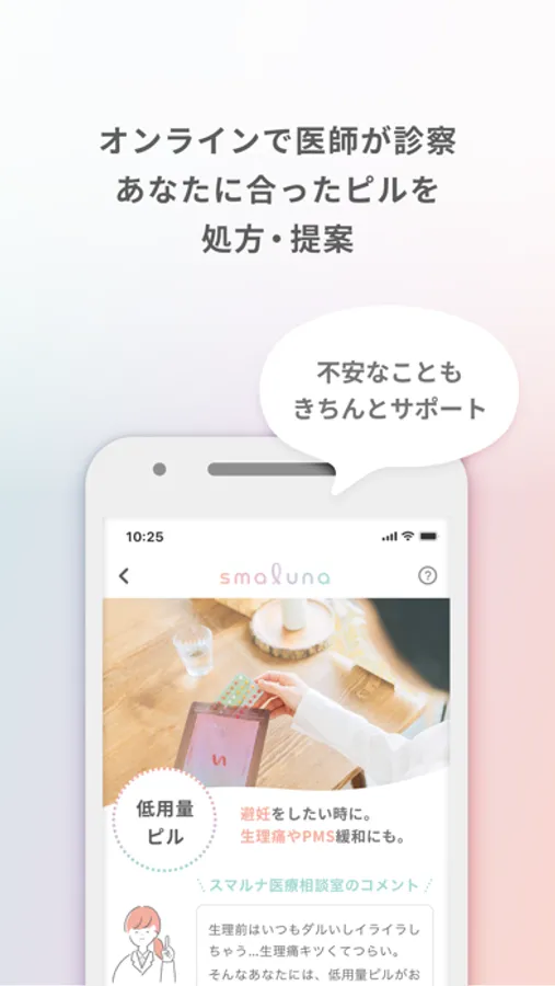 一人ひとりの悩みや不安に合わせて、医師が診察をし、あなたに合ったピルを提案いたします。プライバシーをしっかり守りながら、すぐにお届けします(最短翌日)。