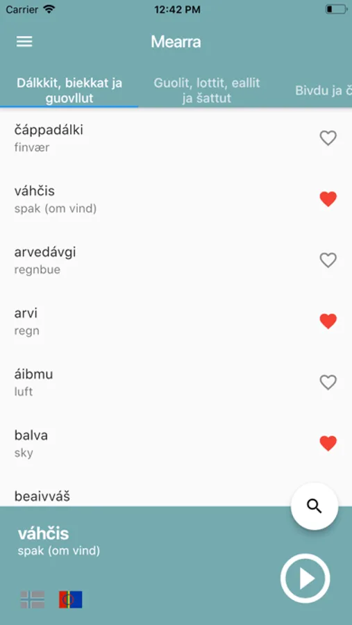 Mearra er et enkelt verktøy for å lære samiske ord knyttet til sjø. Appen inneholder 200 grunnleggende ord med oversettelser og uttalelse. Ordene i appen er i hovedsak innsamlet i Porsangerfjorden og Revsbotn.