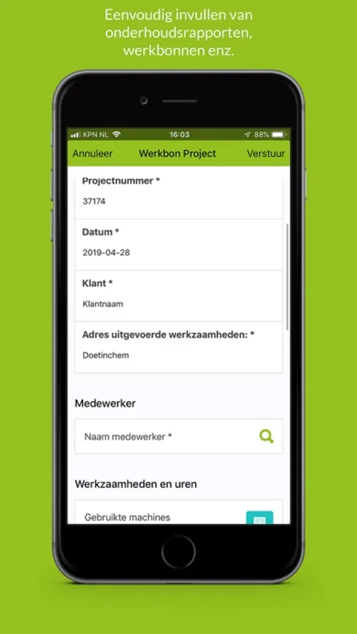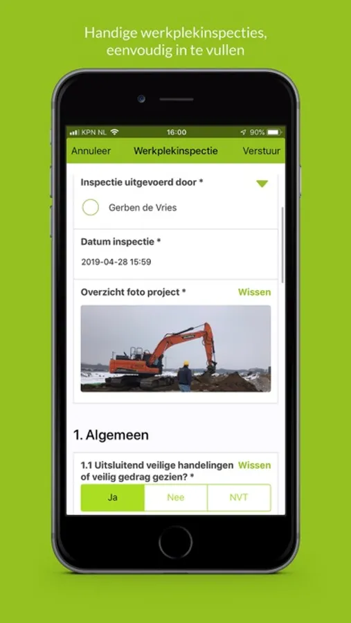 Wilt u via een verzoek sturen naar de gebruiker om een formulier in te vullen of af te ronden? Ook dat is mogelijk! Vraagt u bijvoorbeeld gerust aan uw uitvoerder om de maandelijkse werkplekinspectie uit te voeren door een instructie te verzenden via de App. Ook deels vooraf ingevulde formulieren behoren daarbij tot de mogelijkheden.