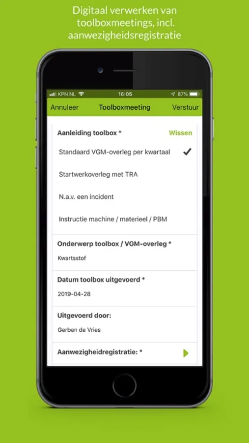 - Toolboxmeetings incl. aanwezigheidsregistratie