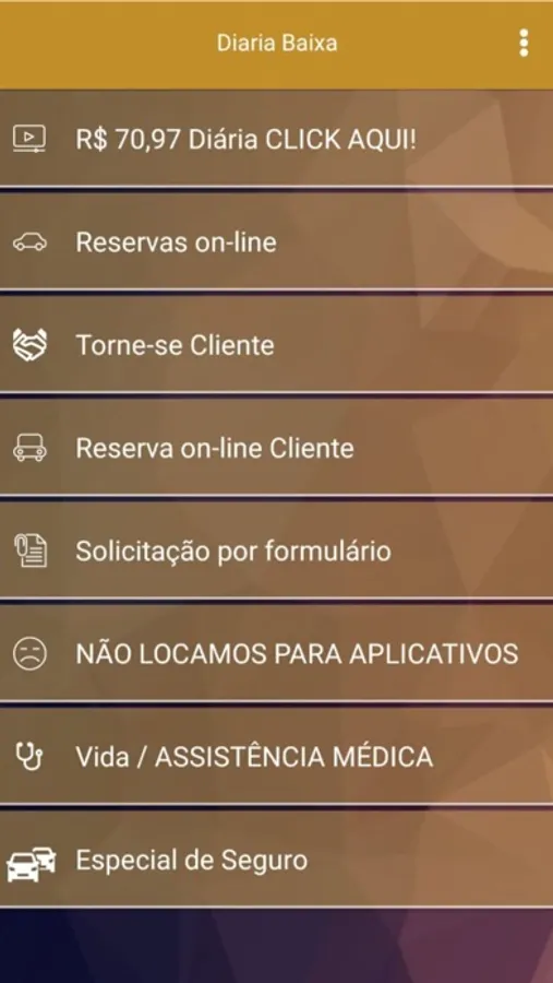 Rent a car from R$70.97 km/free and third-party protection included. Consult monthly rentals with great prices. Learn how to get the best prices in Brazil via our APP service.conomize nas melhores locadoras do Brasil com diárias a partir de R$ 71,00 com km livre e proteções carro e terceiros. Consulte planos mensais. Valores sujeitos a alteração. Lamentamos, mas não locamos para aplicativos.