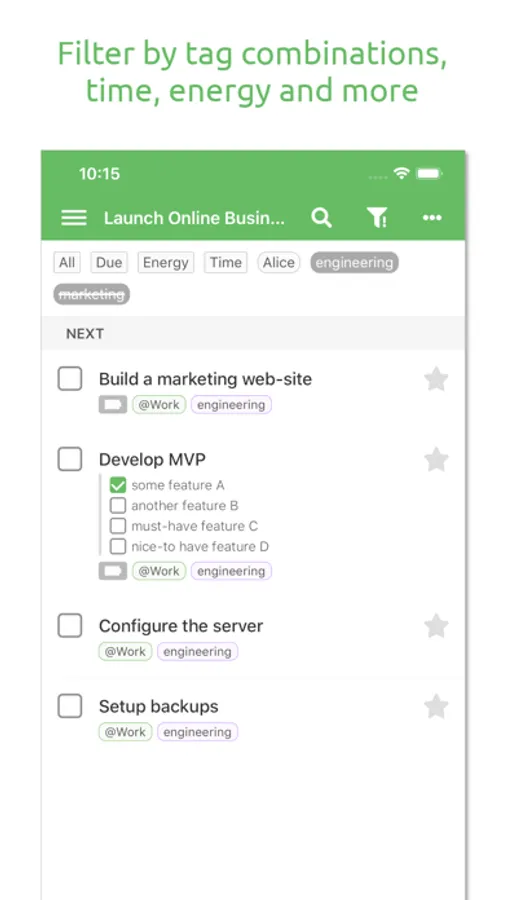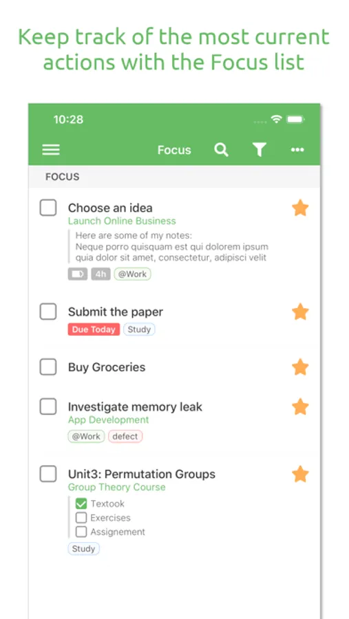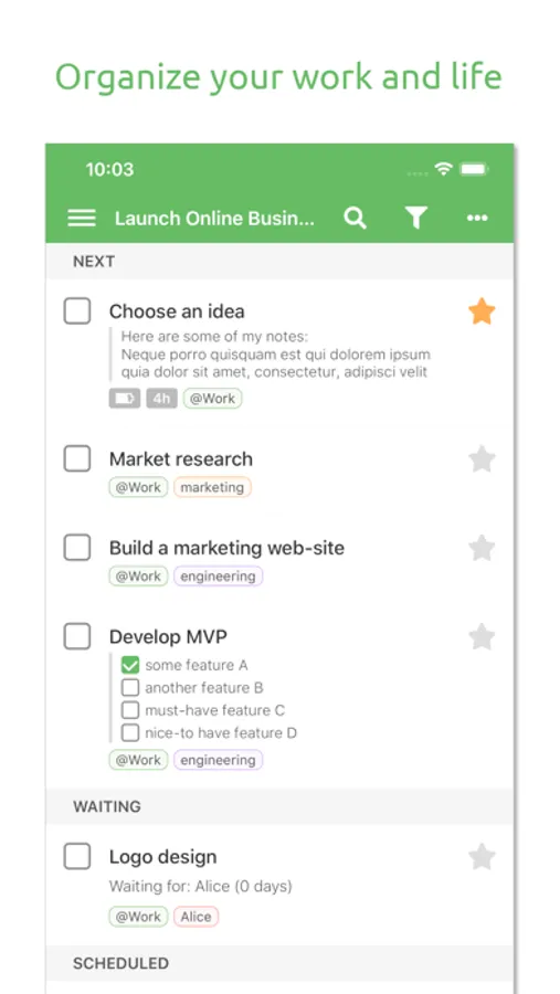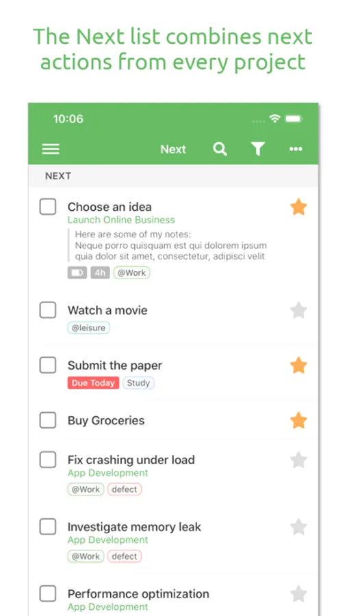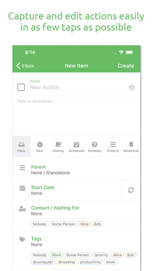 - All GTD lists are supported, including Inbox, Next, Waiting, Scheduled, and more
