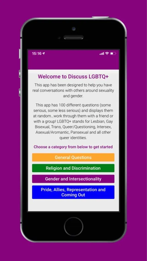 An app designed to help you engage young people and young adults in conversation about LGBT*. The app contains 100 questions, displayed randomly.