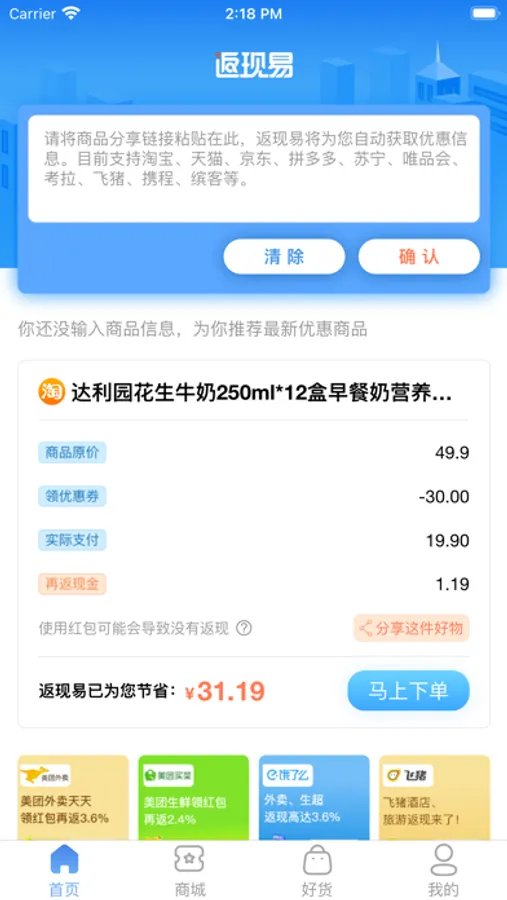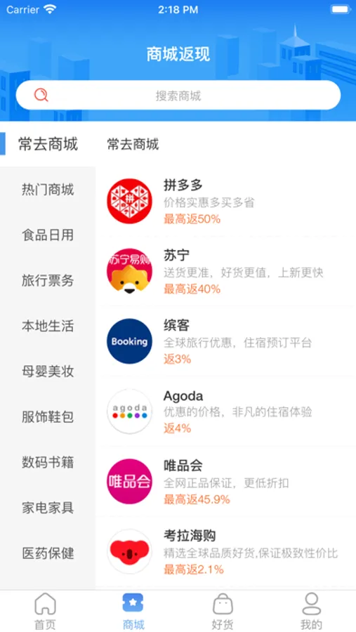 支持跨平台电商返现:我们支持以下电商平台返现:天猫、淘宝、京东、拼多多、苏宁易购、唯品会、考拉海购、中国亚马逊、飞猪、携程、Booking、Agoda、洲际酒店、饿了么