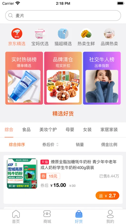 好货热卖里面精选了不同类别的商品,可以自己购买或者推荐朋友购买!里面包括四大模块: