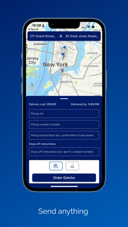 Introducing Getcho (“get-cho”), your go-to On-Demand Courier for hassle-free deliveries! Getcho dispatches highly reliable and professional personal couriers to transport your goods swiftly and securely. Need to pick up your curbside order? Forgot your card at a bar? No problem! Simply rely on Getcho to handle all your delivery needs. Choose Getcho today and experience the ultimate convenience in courier services!