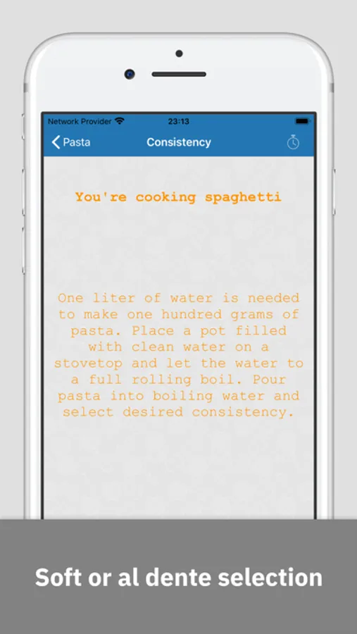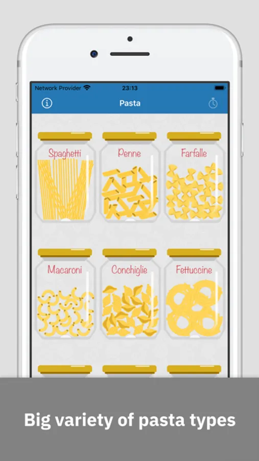 We collected the most popular dried types of pasta in one application and provided them with a preparation timer for two consistencies - al dente and soft.