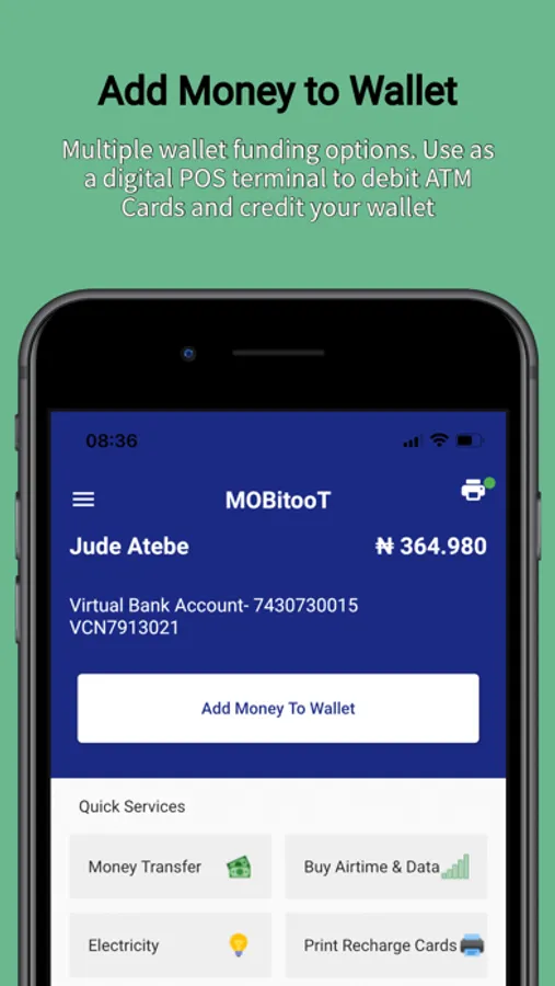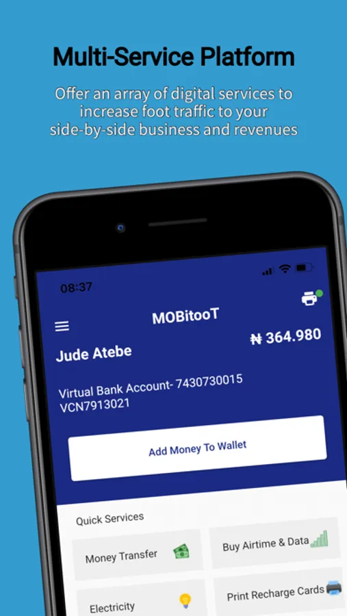 This is an update to the initial release of the MOBitooT mobile app for Apple devices. Users can start their own bill payments, Airtime recharge printing and vending and funds transfer Agency with this app. Discounts are offered on all Airtime and data ranging from 2% to 6% depending on the Mobile network operator.