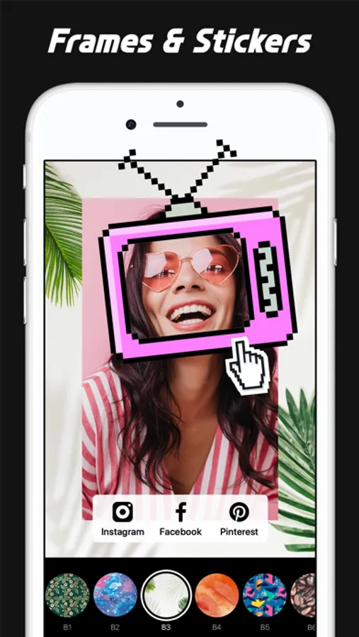 Add beautiful frames to your pictures and choose from 90+ stunning backgrounds (geometric, watercolor, floral, cosmic, marble, wood, etc.).