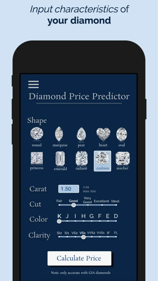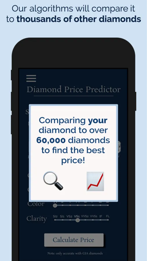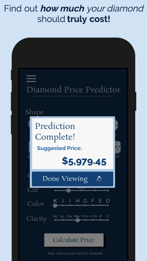 This app calculates the approximate price of a loose diamond using advanced statistical modeling by comparing it to a database of over 60,000 diamonds.