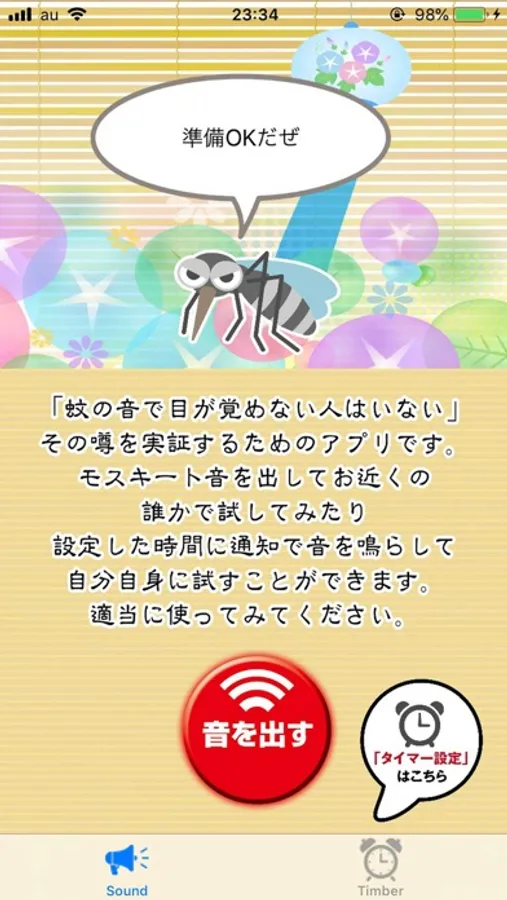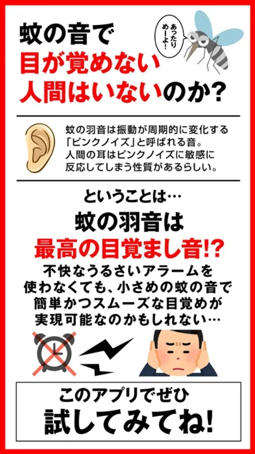 「蚊の音で目が覚めない人はいない」という噂を実際にそうなのか試してみるアプリです。