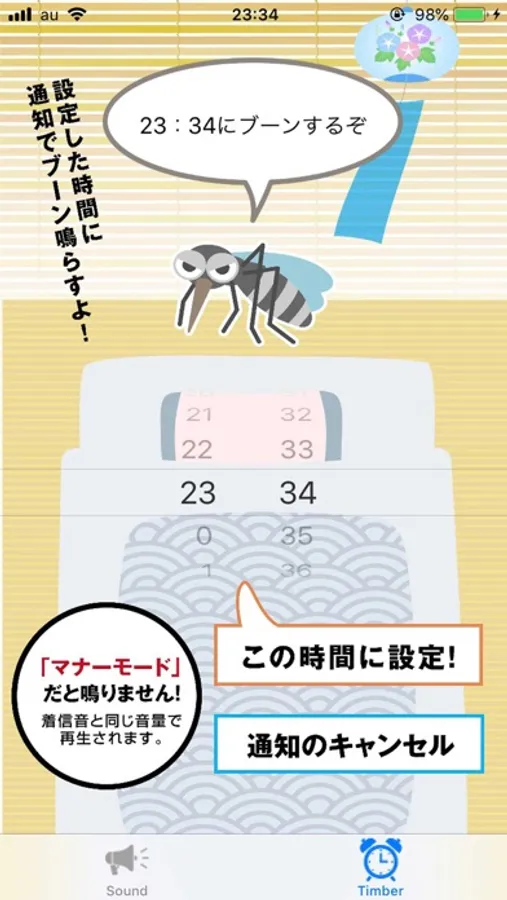 通知機能を使用して、指定した時間にアラームとしてモスキート音を出すこともできるので、自分自身に試すこともできます。