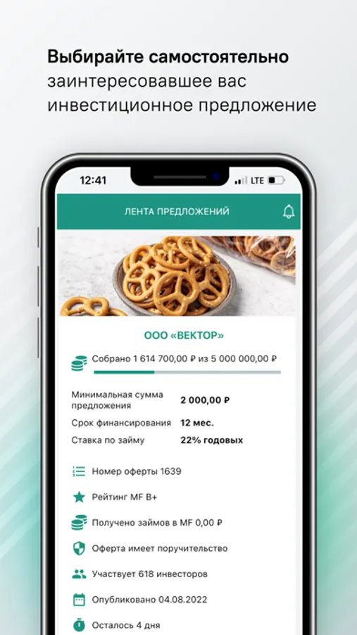После регистрации вам будет доступен список инвестиционных предложений. С приложением вы можете инвестировать свои денежные средства по ставке от 21% до 50% годовых. В карточке заёмщика инвестору доступна полная информация о компании и необходимые для принятия решения финансовые документы заёмщика.