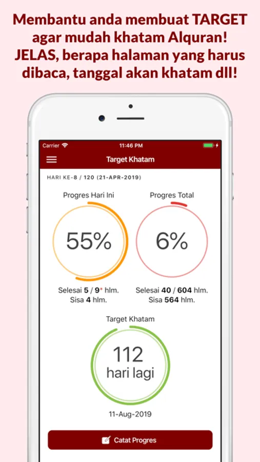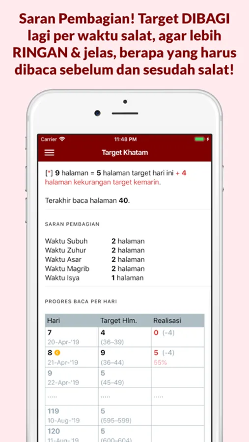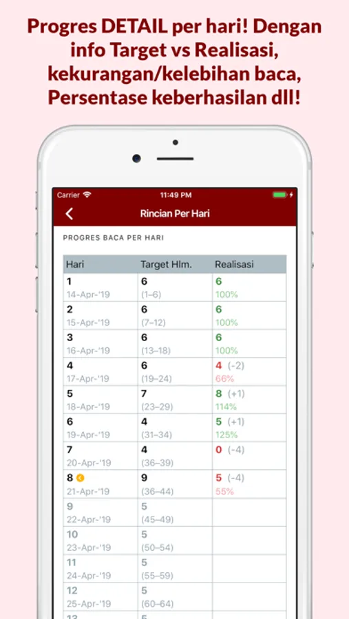 •Progres detail per hari! Dengan info target vs realisasi, kekurangan/kelebihan baca, persentase keberhasilan dll!