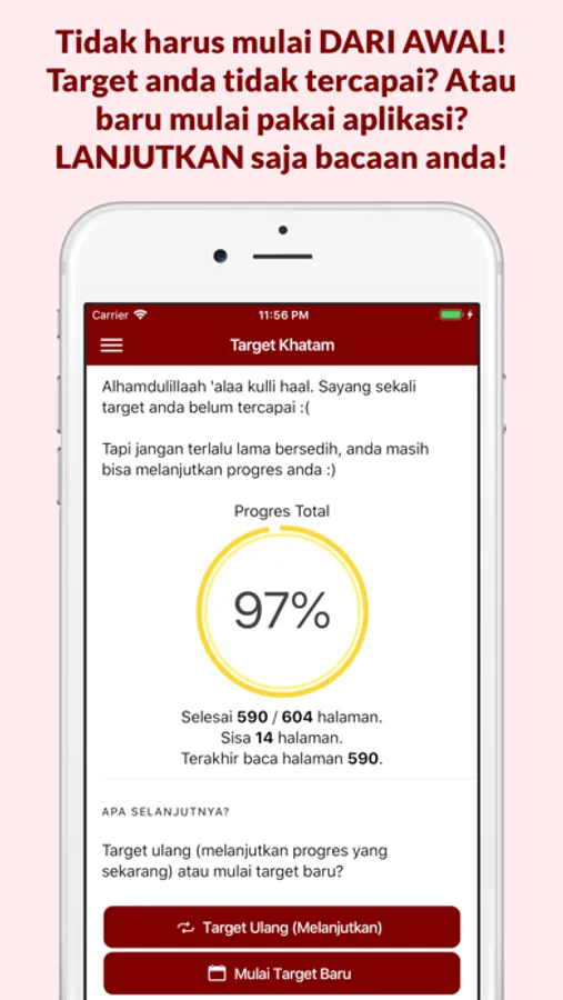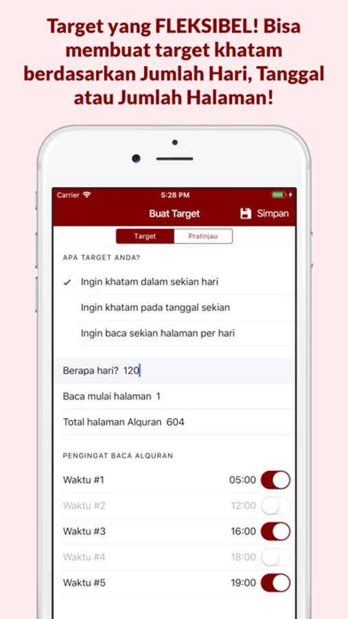 •Target yang fleksibel! Bisa membuat target khatam berdasarkan Jumlah Hari (ingin khatam dalam berapa hari), Tanggal (ingin khatam tanggal berapa) atau Jumlah Halaman (ingin baca berapa halaman per hari)!