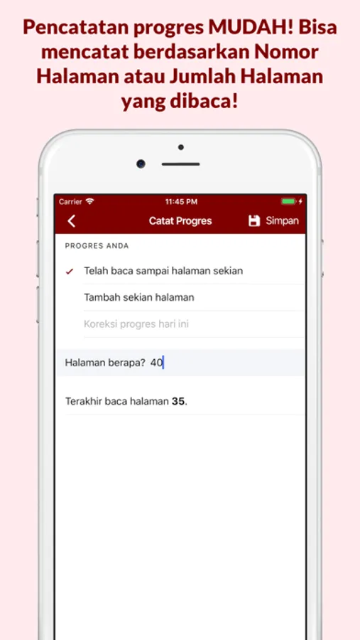 •Tidak harus mulai dari awal! Target anda tidak tercapai? Atau anda baru mulai pakai aplikasi? Tidak masalah! Tentukan ingin baca mulai halaman berapa, dan lanjutkan bacaan anda!
