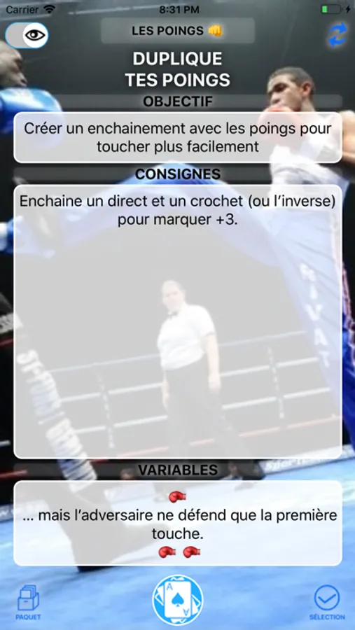Un jeu de carte, avec un tirage au sort pour pimenter les combats en Boxe Française! Les cartes donnent du pouvoir à certains boxeurs et des contraintes aux autres.
