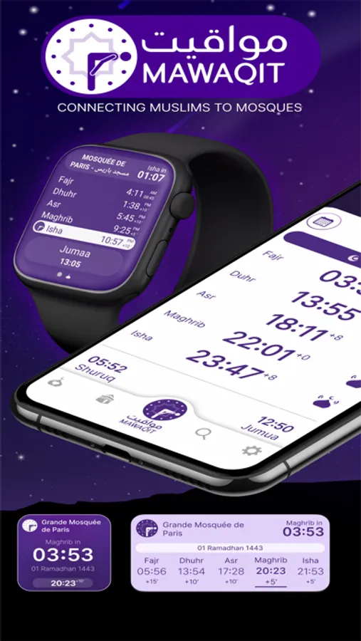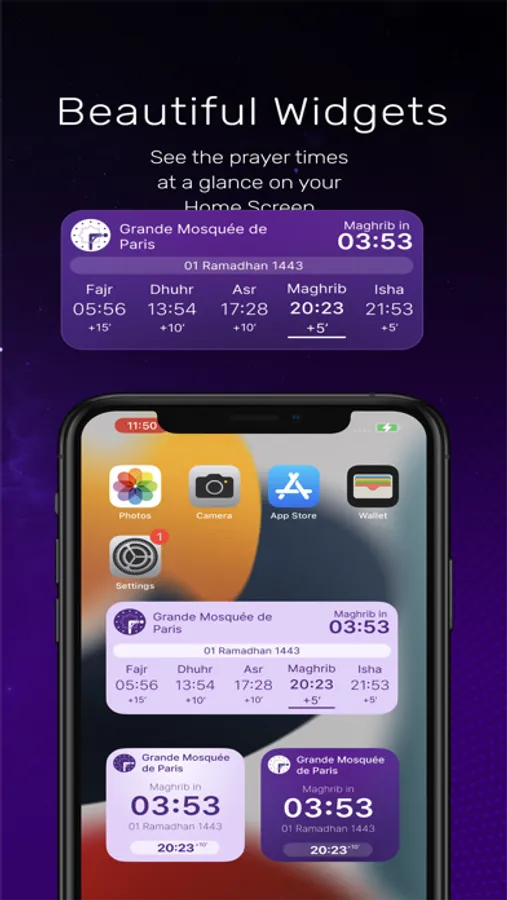 • Widget: See the prayer times, the following prayer, and the Hijri Date at a glance from your home screen.