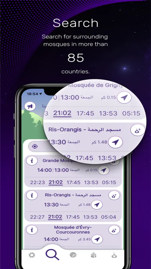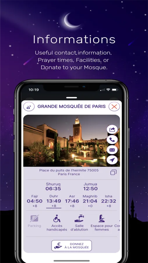Get exact prayer times and real-time information from your favorite mosques. Instantly geolocate the nearest Mosques around you.