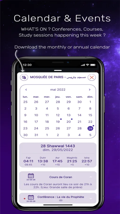 • Hijri calendar: Available at a glance, and downloadable (.pdf A4 format)